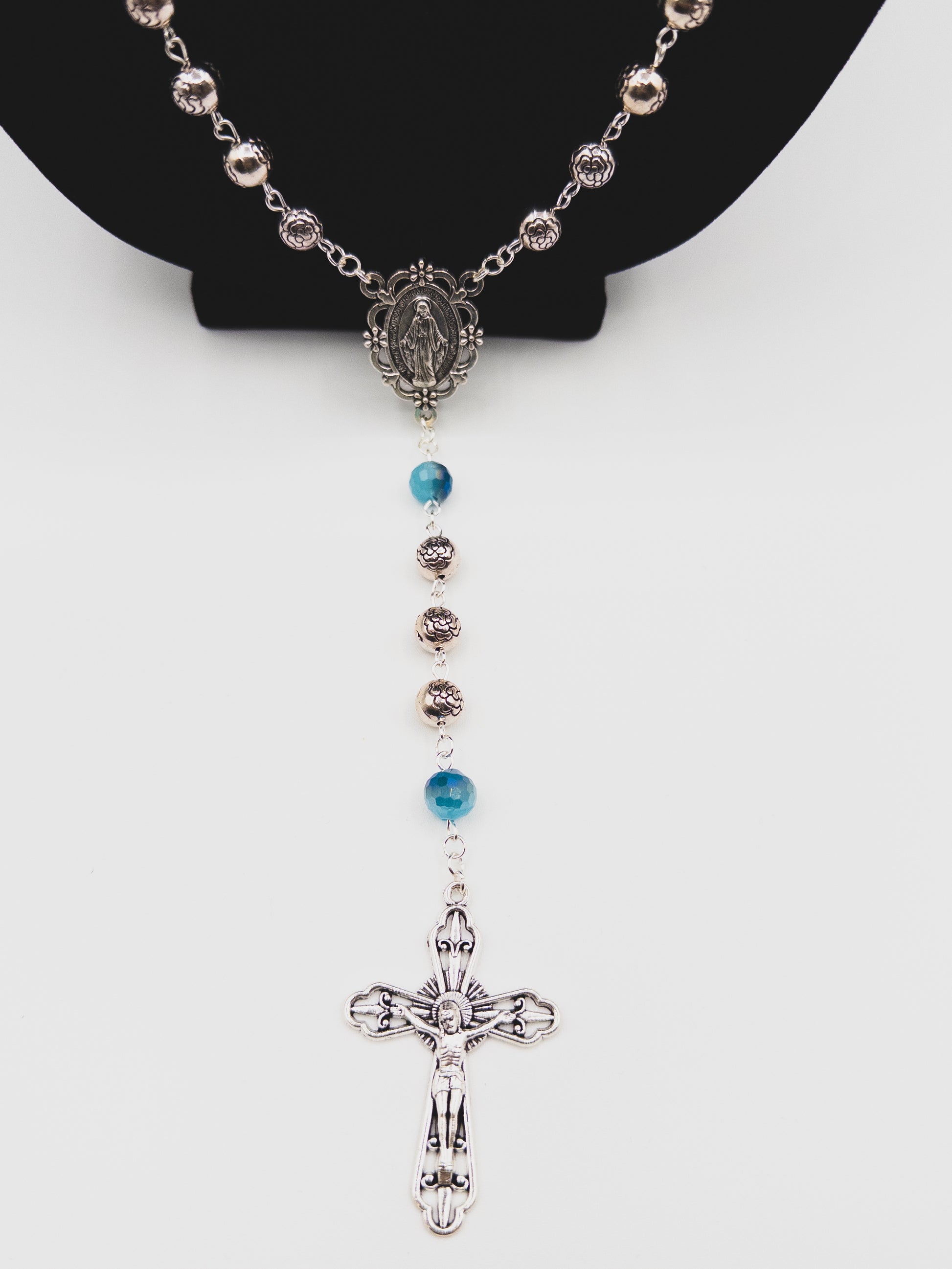 Experience the timeless elegance of this exquisite handmade rosary, featuring intricately engraved metal rose beads paired with luminous fired crystal beads.
